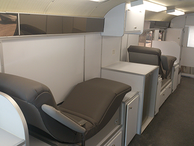 La amplia cabina cuenta con sillones de toma de muestra, así como sillones de donación eléctricos multi posiciones y sillones de recuperación.